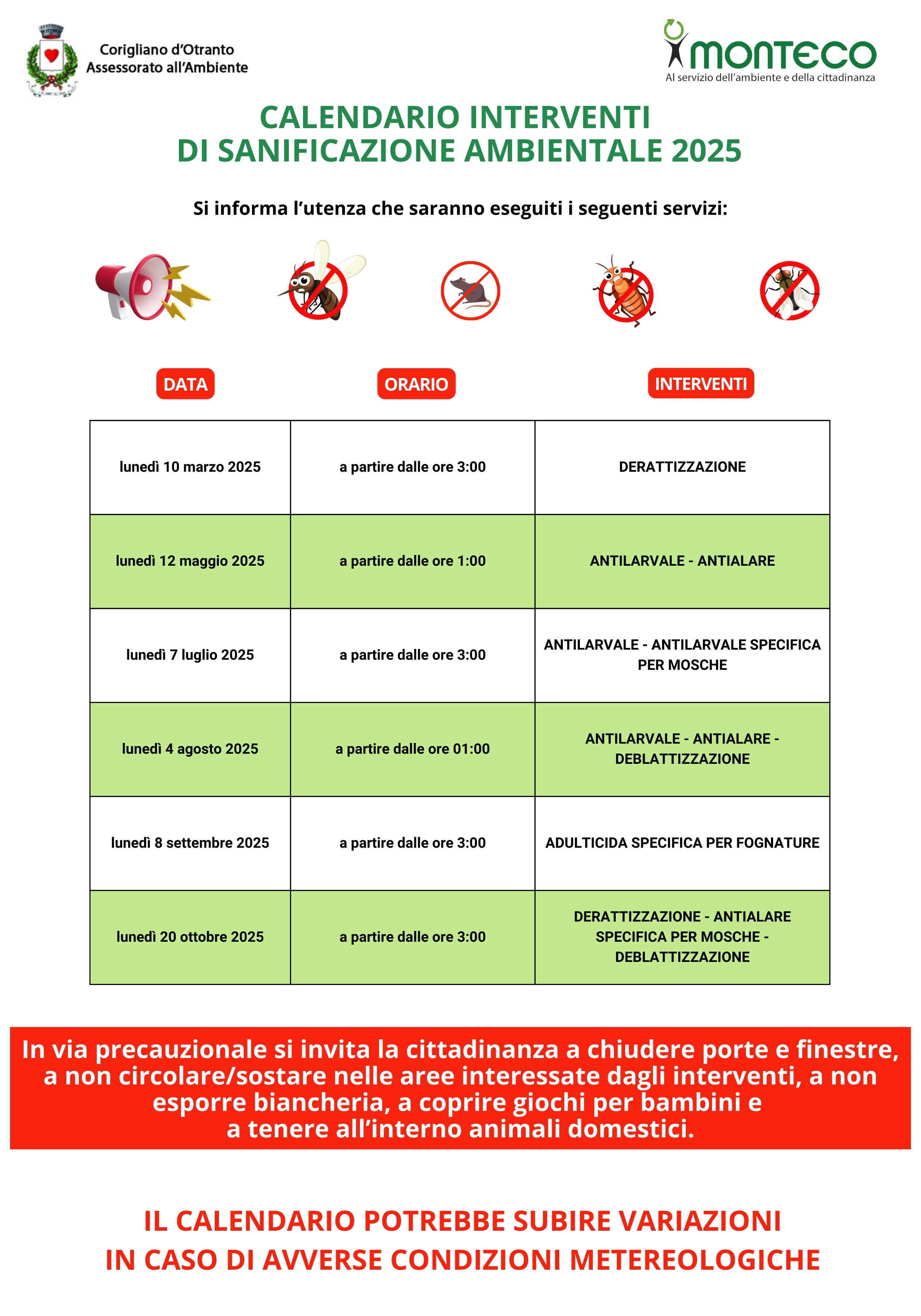 Di seguito sono riportati gli interventi di sanificazione ambientale previsti per l'anno 2025: