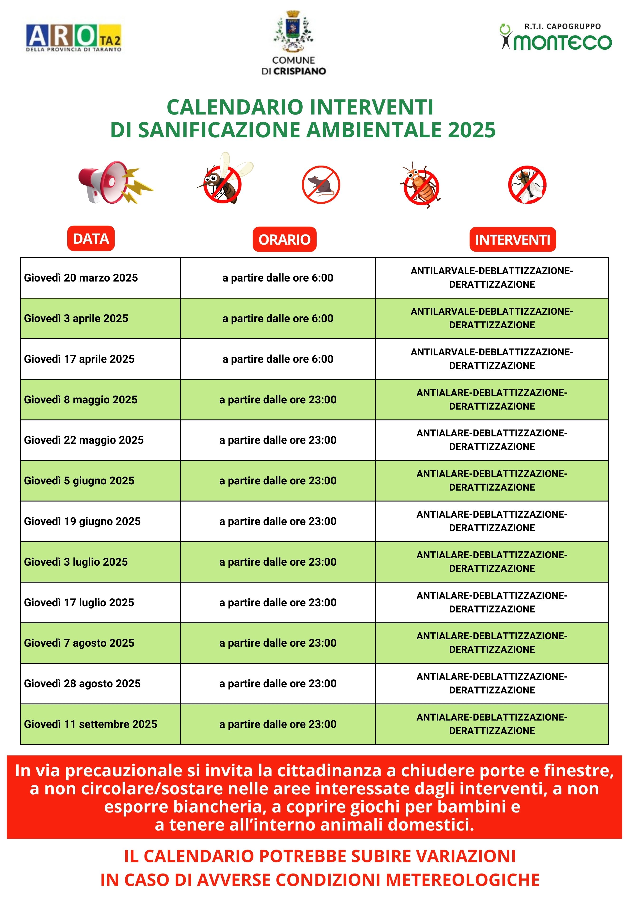 | giovedì, marzo 20, 2025 | A partire dalle ore 6:00 | ANTILARVALE – DEBLATTIZZAZIONE - DERATTIZZAZIONE | |