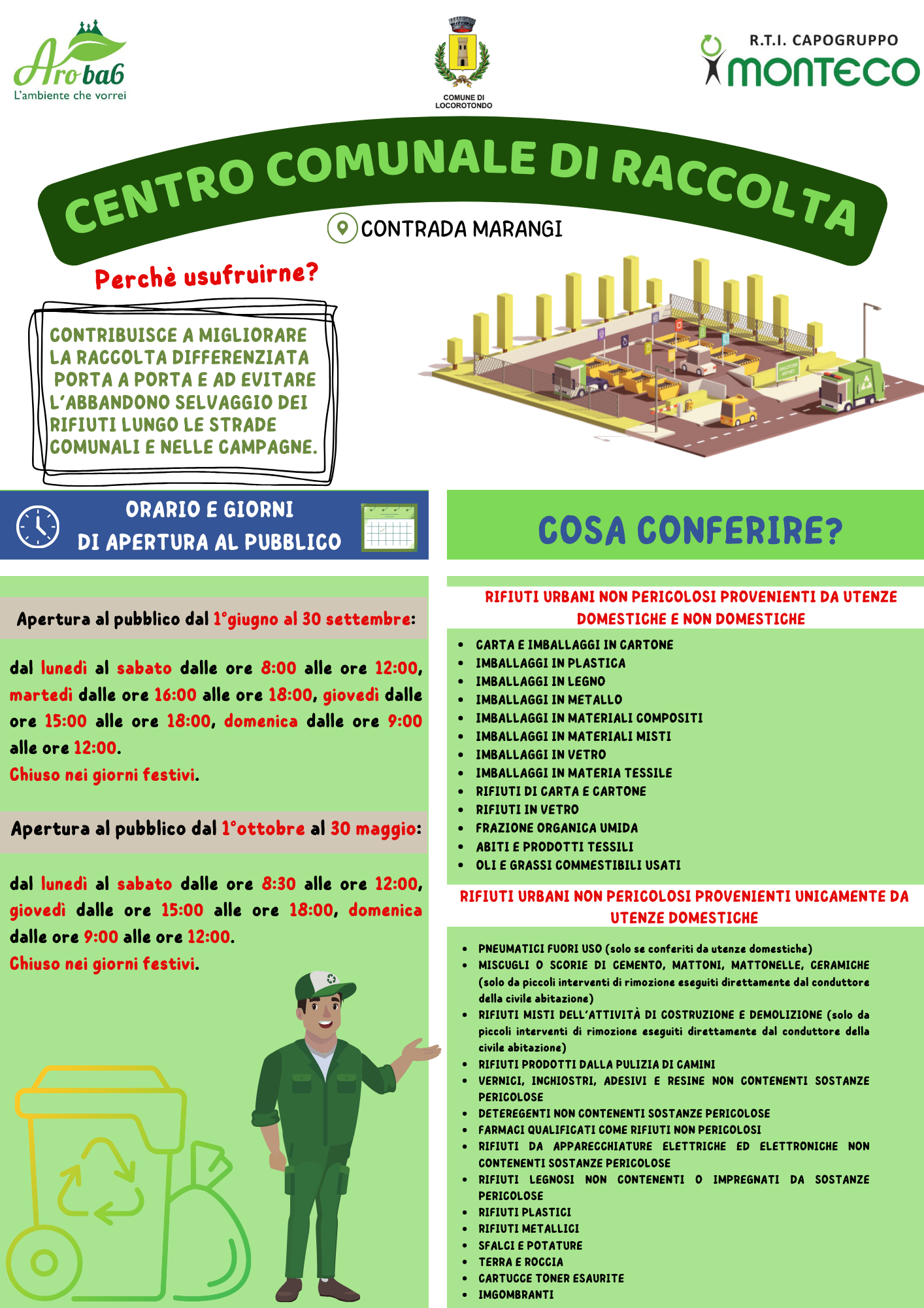 Il ๐‚๐ž๐ง๐ญ๐ซ๐จ ๐‚๐จ๐ฆ๐ฎ๐ง๐š๐ฅ๐ž ๐๐ข ๐‘๐š๐œ๐œ๐จ๐ฅ๐ญ๐š (๐‚๐‚๐‘) del Comune di Locorotondo ๐ฌ๐ข๐ญ๐จ ๐ข๐ง ๐‚๐จ๐ง๐ญ๐ซ๐š๐๐š ๐Œ๐š๐ซ๐š๐ง๐ ๐ข รจ un servizio gratuito a disposizione di tutta la comunitร  iscritta al ruolo TaRi per incrementare e migliorare la ๐ซ๐š๐œ๐œ๐จ๐ฅ๐ญ๐š ๐๐ข๐Ÿ๐Ÿ๐ž๐ซ๐ž๐ง๐ณ๐ข๐š๐ญ๐š โ™ป, ๐๐ข๐ฌ๐ข๐ง๐œ๐ž๐ง๐ญ๐ข๐ฏ๐š๐ซ๐ž ๐ฅ'๐š๐›๐›๐š๐ง๐๐จ๐ง๐จ ๐š๐›๐ฎ๐ฌ๐ข๐ฏ๐จ ๐๐ž๐ข ๐ซ๐ข๐Ÿ๐ข๐ฎ๐ญ๐ข sul territorio comunale e per ๐š๐ ๐ž๐ฏ๐จ๐ฅ๐š๐ซ๐ž anche il ๐ซ๐ž๐œ๐ฎ๐ฉ๐ž๐ซ๐จ ๐๐ž๐ฅ ๐ซ๐ข๐Ÿ๐ข๐ฎ๐ญ๐จ โ™ป