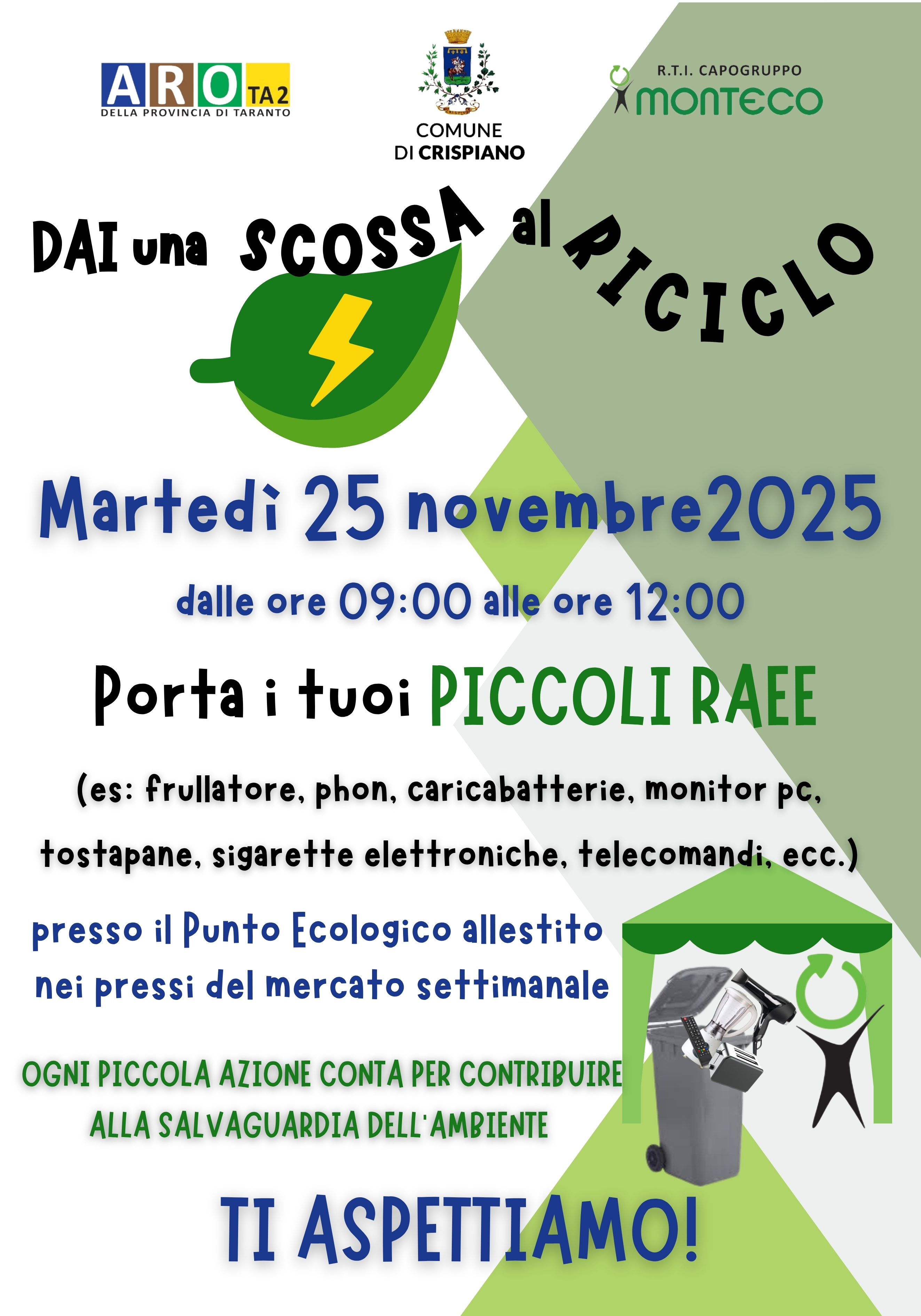 Martedì 25 Novembre 2025 dalle ore 09:00 alle ore 12:00 porta i tuoi PICCOLI RAEE (es: frullatore, phon, caricabatterie, monitor pc, tostapane, sigarette elettroniche, telecomandi, ecc.) presso il Punto Ecologico allestito nei pressi del mercato settimanale.