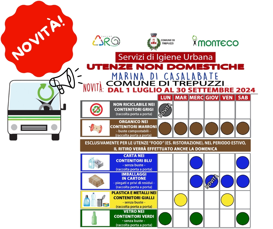 Si informano i cittadini residenti nella Marina di Casalabate nel tratto di competenza del Comune di Trepuzzi che dal prossimo 1 Luglio e fino al 30 Settembre 2023 il calendario di raccolta dei rifiuti subirà le seguenti variazioni: