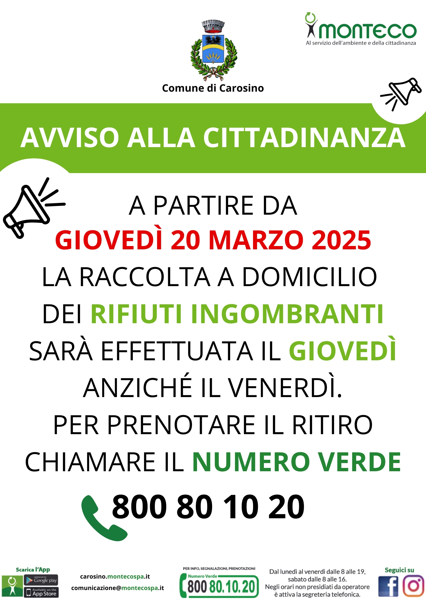 A partire da giovedì 20 marzo 2025, la raccolta a domicilio dei rifiuti INGOMBRANTI sarà effettuata il GIOVEDÌ anziché il VENERDÌ. Per prenotare il ritiro chiamare il numero verde 800 80 10 20.