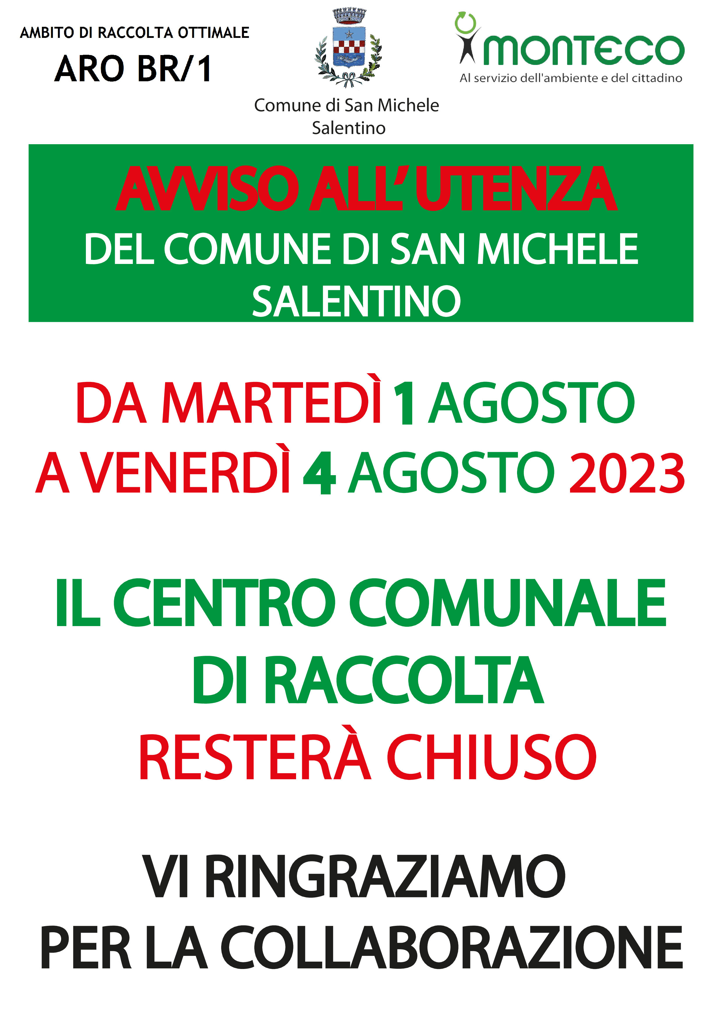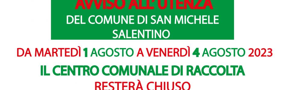 Si avvisa l'utenza del Comune di San Michele Salentino che nelle date 1, 2, 3, 4 agosto 2023 il Centro Comunale di Raccolta resterà chiuso per la manifestazione di pubblico spettacolo prevista per il 3 agosto presso la zona p.i.p.