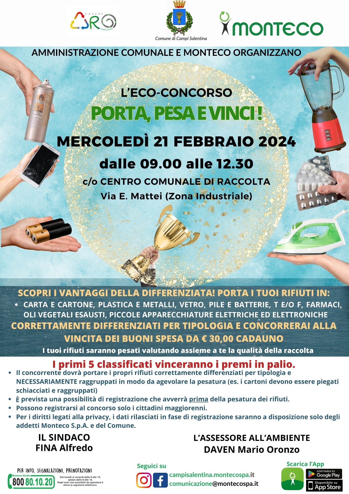 L’Eco Concorso “Porta Pesa e Vinci!”, organizzato dall'Amministrazione Comunale in collaborazione con Monteco S.p.A. torna a Campi Salentina con l’obiettivo di promuovere sia l'uso del Centro Comunale di Raccolta che i vantaggi della Raccolta Differenziata incentivando la cittadinanza ad una corretta differenziazione dei rifiuti e stimolandone maggiormente l'impegno mediante una competizione virtuosa a premi.