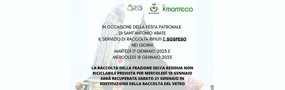 Si informano i cittadini che, in occasione dei Festeggiamenti dedicati al Patrono Sant'Antonio Abate, il servizio di raccolta dei rifiuti sarà SOSPESO nei giorni di martedì 17 Gennaio 2023 e mercoledì 18 Gennaio 2023.
