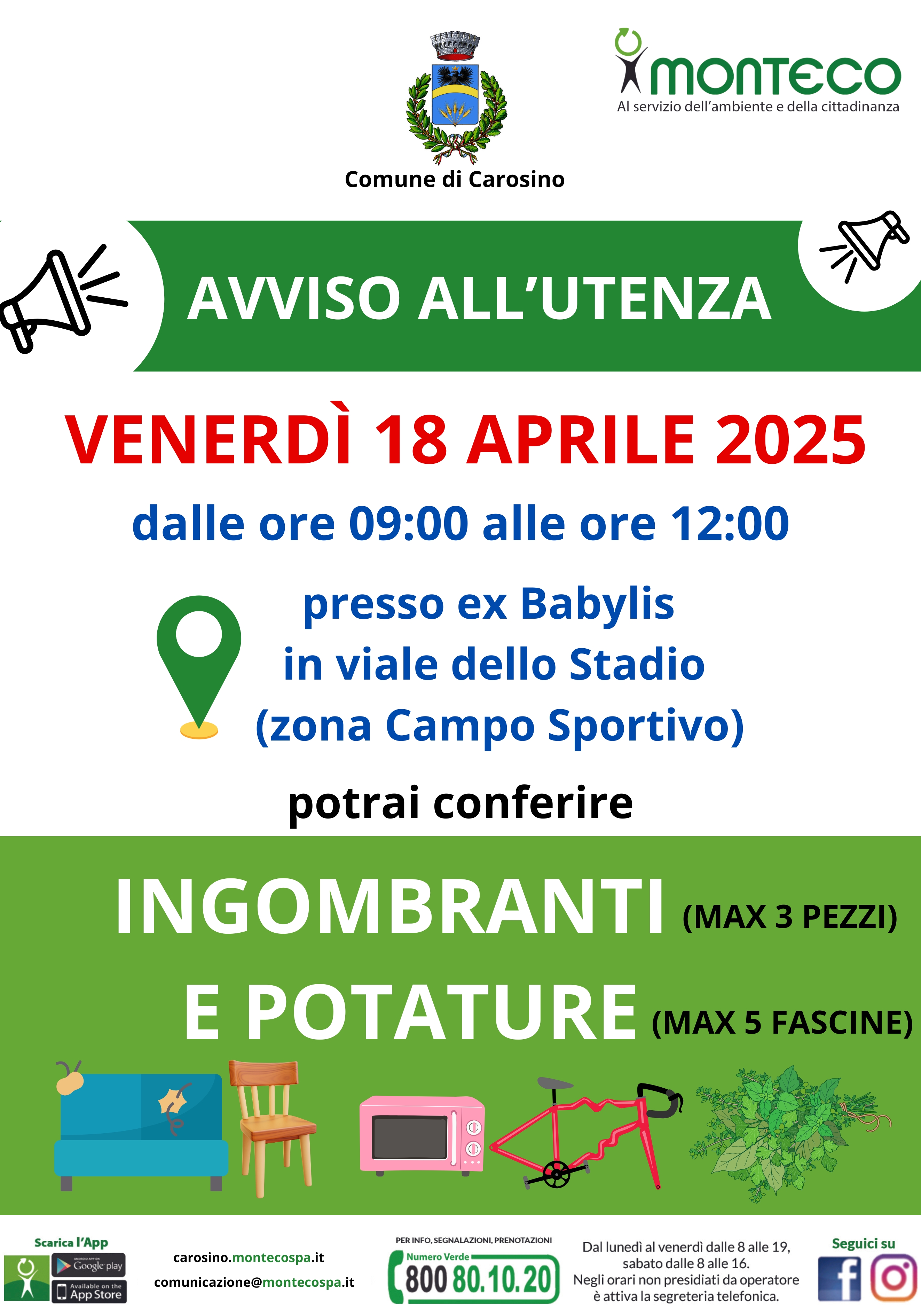 Si informa la cittadinanza che venerdì 18 APRILE 2025 dalle ore 09:00 alle ore 12:00, straordinariamente, sarà possibile conferire ingombranti e potature presso ex Babylis in viale dello Stadio (zona Campo Sportivo).