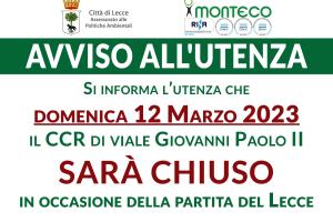 AVVISO ALL'UTENZA: CHIUSURA TEMPORANEA CCR VIALE GIOVANNI PAOLO II